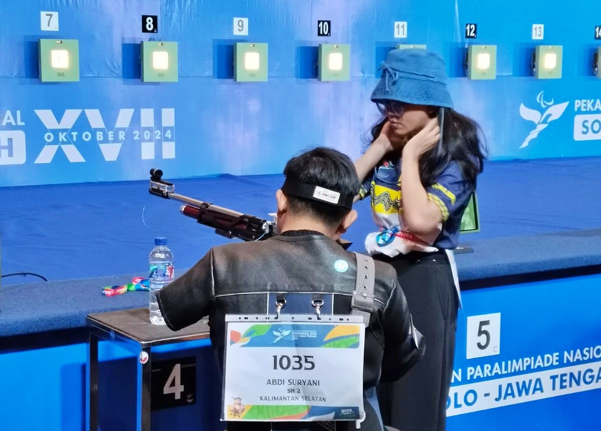 Abdi Suryani bersiap di arena Peparnas XVII Solo 2024. Nomor punggung 1035 menjadi saksi perjuangannya meraih medali untuk Kalimantan Selatan.Di tenga...